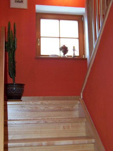 plánujeme si renovovat schodiště v starším domě dle námětu viz. druhé foto./dřevo pravděpodobně jasan, okna tmavý rám/.Chtěla jsem se zeptat jakou barvu dlažby a stěn zvolit v předsíňce viz. třetí foto, aby na ni schodiště vkusně navazovalo. Moc děkuji za odpověď.